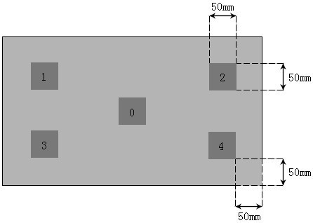 對同一片玻璃在其4個角和正中間分別切取50mm×50mm的樣品5小塊,試樣外邊緣距玻璃邊緣為50mm,以中間樣品編號為0號,其余4個角樣品編號分別為1、2、3、4號,如圖1所示。