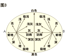 | 再來(lái)說(shuō)說(shuō)黃色。檸檬的黃色和梨的黃色相比較又如何? 你可能會(huì)說(shuō)檸檬的黃色更明亮一些,但除此以外還有一個(gè)大的差別就是檸檬的黃色顯得鮮艷, 而梨的顏色則顯得陰晦。 這種差別稱(chēng)之為色飽和度或鮮艷度。 從圖2可以看出,紫紅和綠兩色的飽和度分別由中心向兩側(cè)隨水平距離的增加而變化。 離中心越近,色彩越陰晦;離中心越遠(yuǎn),則越鮮艷。 圖3標(biāo)出了一些常用的描述色彩亮度和色飽和度的形容詞。 至于這些形容詞表達(dá)了什么,請(qǐng)?jiān)倏匆幌聢D2。 | |