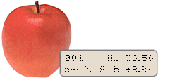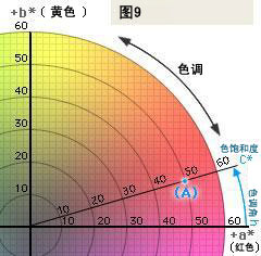 | L*C*h色空間使用與L*a*b*色空間一樣的色度圖,但是它使用柱面坐標(biāo)而不是直角坐標(biāo)。 在該色空間中,L*代表亮度且與L*a*b*色空間中的L*相同,C*為色飽和度,h為色調(diào)角。 在圓心處色飽和度C*的值為0,離圓心越遠(yuǎn)C*值越大。 色調(diào)角被規(guī)定為從+a*軸開始并以度數(shù)表示: 0為+a*(紅),90為+b*(黃),180為-a*(綠),270為-b*(藍(lán))。 如果我們用L*C*h色空間來(lái)測(cè)量蘋果的顏色,我們將得到下列結(jié)果。 如果我們把這些值描繪在圖9上,我們就得到點(diǎn)(A)。 |