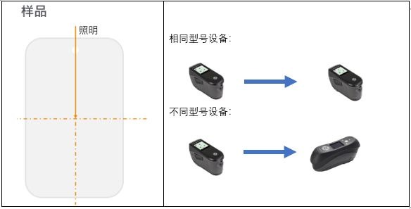 這里要值得注意的是設(shè)備的光源方向性,如光源結(jié)構(gòu)圖所示,光源是在儀器的一側(cè),而并非是在測(cè)量點(diǎn)的正上方,儀器旋轉(zhuǎn)90°或180°測(cè)量,那就相當(dāng)于光源位置以及觀(guān)察角度都發(fā)生了變化,會(huì)導(dǎo)致測(cè)量數(shù)據(jù)的差異。所以在進(jìn)行臺(tái)間差對(duì)比的時(shí)候首先兩臺(tái)儀器的照明方向需保持一致。