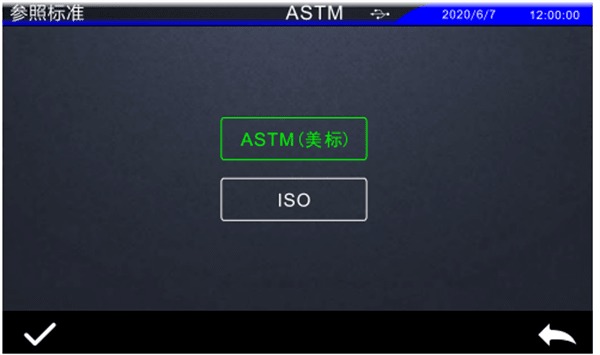 在主菜單中點(diǎn)擊“參照標(biāo)準(zhǔn)”,進(jìn)入?yún)⒄諛?biāo)準(zhǔn)設(shè)置界面,可選擇ASTM(美標(biāo))或者ISO。選中“ASTM(美標(biāo))”,點(diǎn)擊確認(rèn)“√”,儀器進(jìn)入ASTM(美標(biāo))測(cè)量標(biāo)準(zhǔn);選中“ISO”,點(diǎn)擊確認(rèn)“、√”,儀器切換到ISO測(cè)量標(biāo)準(zhǔn)。如圖所示。
