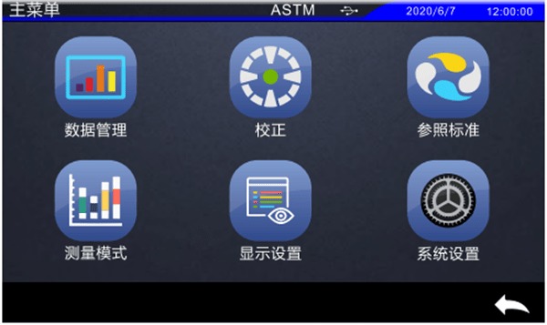 參照標(biāo)準(zhǔn)有ASTM(美標(biāo))和ISO兩種,本系列儀器在ASTM(美標(biāo))和ISO標(biāo)準(zhǔn)切換后,進(jìn)行樣品測(cè)量時(shí),儀器需要重新進(jìn)行校正。在測(cè)量界面按“介”進(jìn)入主菜單,在其他界面可以通過(guò)點(diǎn)擊下側(cè)的確認(rèn)“√”、返回“〈”進(jìn)入主菜單,如圖所示。