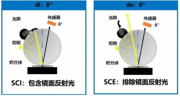 SCI和SCE一般只會出現在d/8結構的分光測色儀器的設置選項中,SCI指包含鏡面光方式,一般用于那些研究顏色本身屬性而不關心顏色所附著的樣品表面光澤度的廠家,如油漆涂料廠等。SCE指不包含鏡面光方式,一般適用于那些直接被人觀測到的,要求測量結果和目視非常接近的樣品,如家電外殼等。