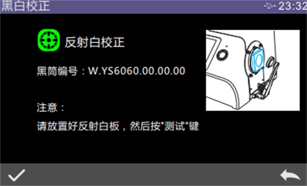 反射黑校完成后自動進入反射白校界面,放好白板(與安放黑筒的步驟相同),然后按測量鍵進行白校正,或點擊“←”取消并退出校正。