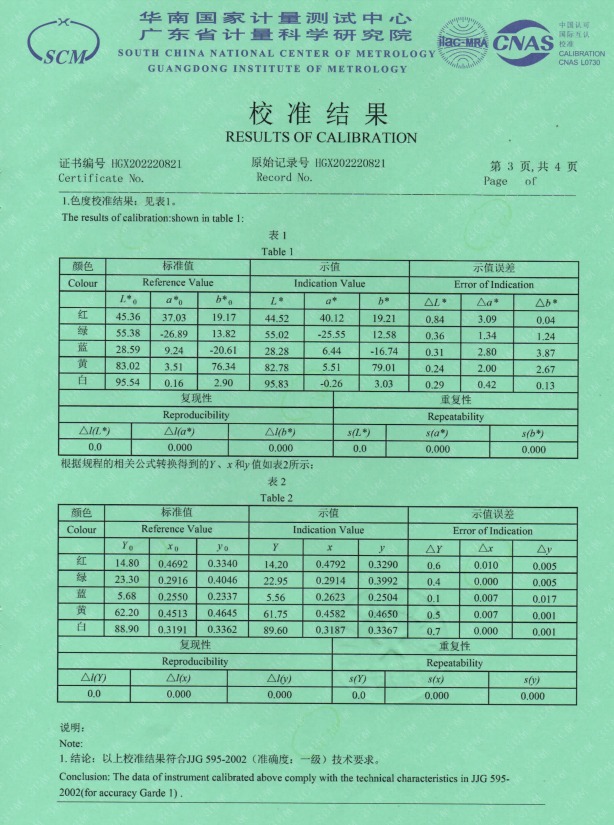 為了觀察得更為直觀,可以參看一級色差儀計量證書,示例:配色云色差寶PSY01。