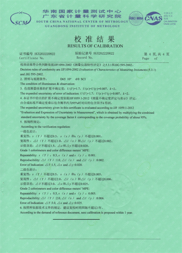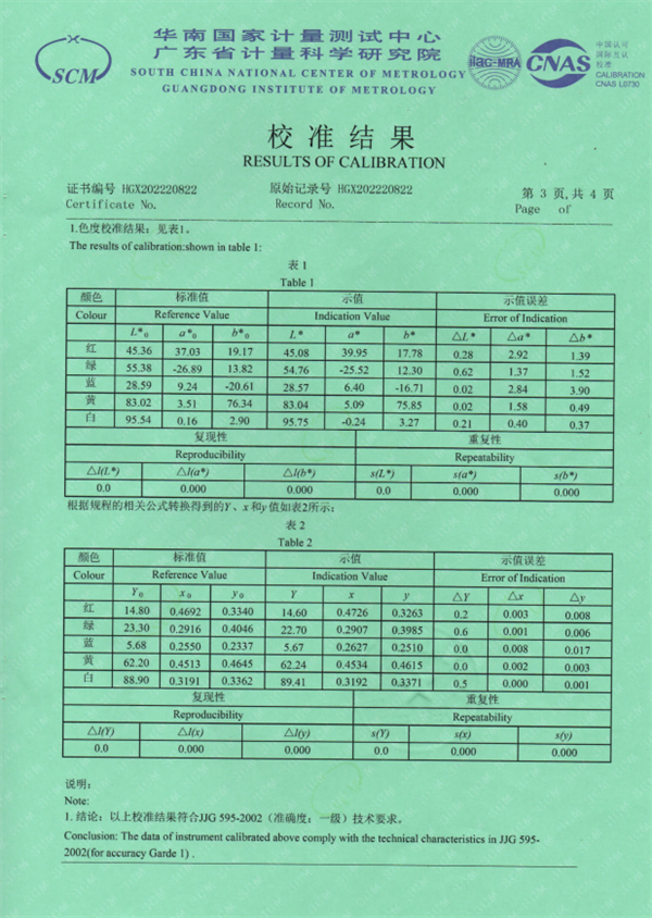 為了觀察得更為直觀,可以參看一級(jí)色差儀計(jì)量證書(shū).