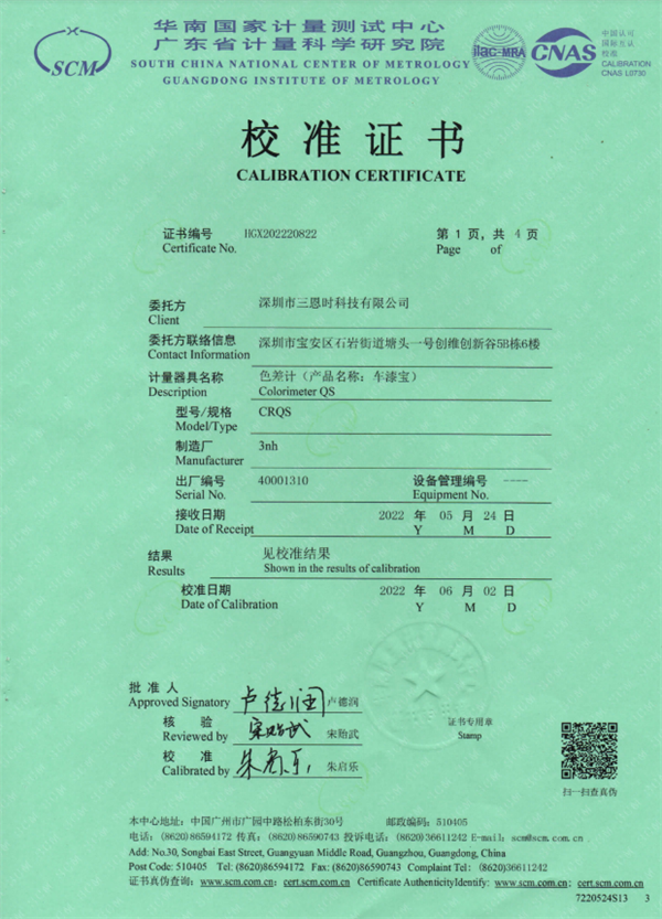 車(chē)漆寶CRQS校準(zhǔn)證書(shū)如下: