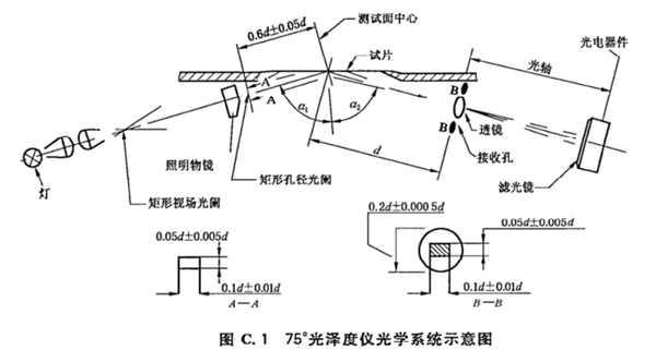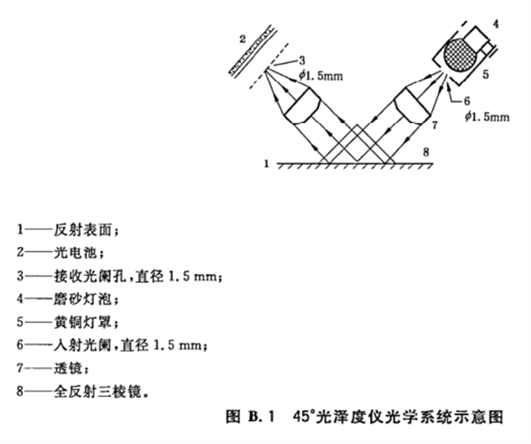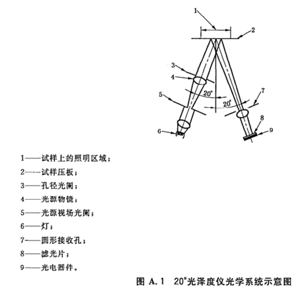用光電檢測器測定與法線成一定角度(20°、45°、75°)人射到試樣表面,并從試樣表面與法線成相應(yīng)角度(20°、45°、75°)反射到規(guī)定孔徑內(nèi)的光,其結(jié)果顯示在儀器上。