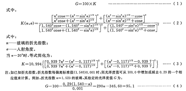 潔凈的拋光黑玻璃板,由其在 587.6 nm波長下測量的折光指數(shù)來計算20°鏡面反射。如折光指數(shù)不是1.540,則光澤度值由下式計算: