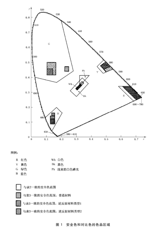 滿足精確顏色要求的安全色色度范圍應符合表3的要求,磷光色的對比色和亮度因數應如圖1和表4所示。