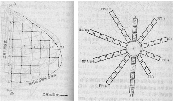 塞爾顏色圖冊》中一般給出每種色調的2.5,5,7.5,10四個等級,全圖冊包括40 種色調的顏色卡片。
