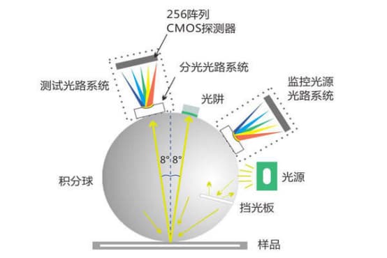 色差儀的積分球發出光的作用是將來自被測物體表面的所有可見光都集中在一個小圓球上,然后通過狹縫將這些光傳到積分球中心。此時,透過狹縫看到的是積分球內部的光斑。由于積分球內部具有很多顆粒,因此可以將各個波長的光分開。