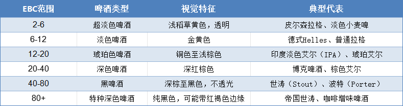 以下是啤酒色度 EBC(European Brewery Convention)標(biāo)準(zhǔn)值 的詳細(xì)分類及對應(yīng)啤酒類型的專業(yè)解析,附參考圖表和測量注意事項: