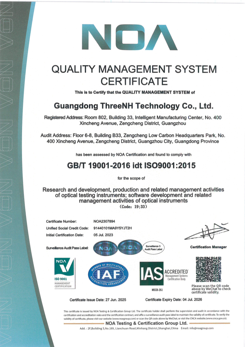 此次認證覆蓋了企業管理的全方位流程,包括產品研發、生產控制、供應鏈管理、售后服務等各個環節。三恩時能夠連續獲得這一認證,證明企業已建立起科學完善的質量管理體系,能夠持續穩定地向客戶提供高質量的產品和服務。在色彩測量行業競爭日趨激烈的今天,這一認證無疑增強了企業的市場公信力與品牌影響力。