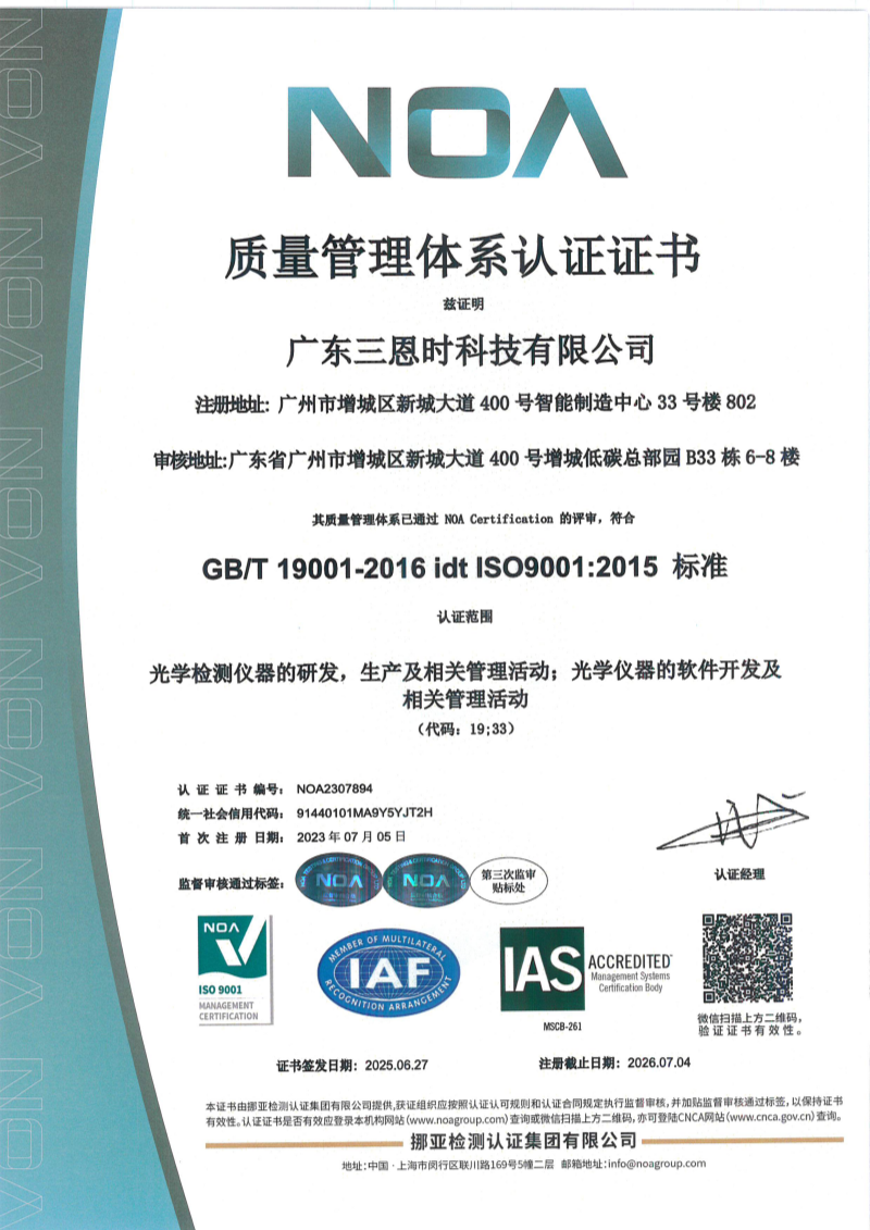 ISO 9001認證為三恩時提供了強大的戰略支撐。在色彩測量行業,質量是企業的生命線,直接關系到產品的可靠性與準確性。通過認證的質量管理體系能夠確保產品從設計到服務的全過程質量可控,為企業的長期發展提供保障。