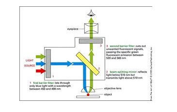 熒光鏡檢術是用短波長的光線照射用熒光素染色過的被檢物體,使之受激發(fā)后而產生長波長的熒光,然后觀察。