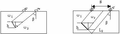 對于有傾角的裂紋,如下圖,若上端點和下端點由一次波探測到(左圖),一次波聲程分別為ω1和ω2,則其垂直高度h為