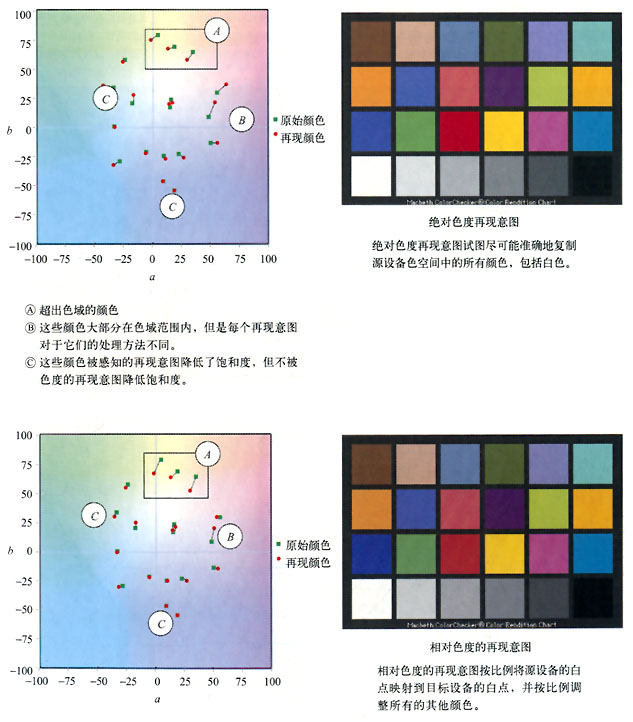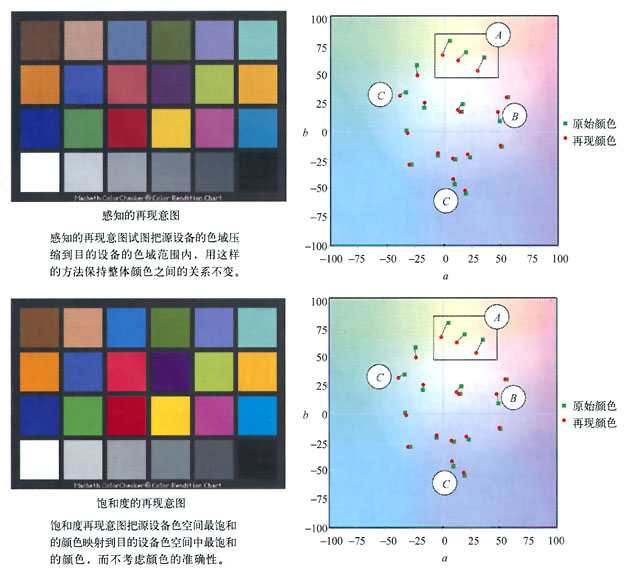 ICC特屬于文件規(guī)范中包含了4種處理超出色域顏色的不同方法,這種不同的處理方法就叫做現(xiàn)現(xiàn)意圖(如圖3-4所示)。感知的和飽和度的再現(xiàn)意圖使用色域壓縮方案,即把源設(shè)備色空間中顏色的飽和度降低,使這些顏色能夠與目的設(shè)備的色域相吻合。相對色度和絕對色度再現(xiàn)意圖使用色域裁剪方案,即將所有超出色域的顏色直接剪切掉,用與它們接近的顏色來代替。