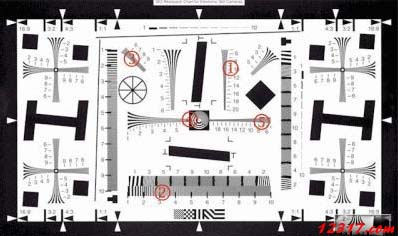 因此,MTF發展了幾十年,同樣的所翻拍的樣圖也不斷的在跟著演進,已符合目前一般拍攝狀況時的實際需要。我們看 ISO Camera Resolution Chart ISO12233 就是很好的例子,這個時期的解像力圖已 針對模仿實際場景做了調整,不僅線條改以雙曲線逼近制作,格式也不再清一色是直線和橫線了。請注意到上面用紅色號碼標記的五個點,為此圖特有用于目測解像力之性能: