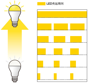 PWM 是" 脈沖寬度調(diào)制" 的縮寫," 脈沖寬度調(diào)制" 是一種通過(guò)控制脈沖信號(hào)ON 期間和OFF 期間的比率來(lái)控制信號(hào)強(qiáng)度的方法。脈沖信號(hào)是一種在ON 和OFF 之間反復(fù)交替的信號(hào),ON期間在一個(gè)周期中的百分比被稱為" 占空比"。PWM 控制照明是一種通過(guò)控制來(lái)自脈沖發(fā)射源光占空比(發(fā)光時(shí)間)來(lái)控制燈亮度的方法。 發(fā)光時(shí)間越長(zhǎng),光就會(huì)變得越亮;反過(guò)來(lái),發(fā)光時(shí)間越短,光就會(huì)變得越暗。