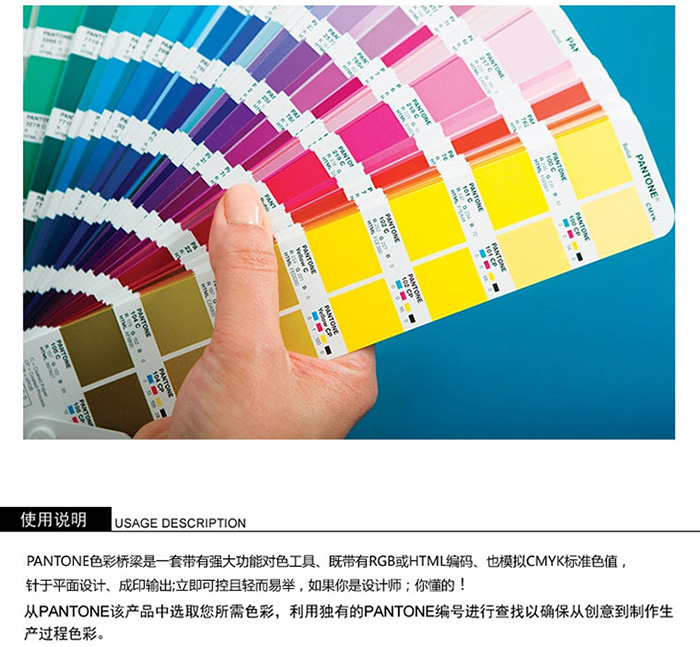 它可用于選擇和指定PANTONE專色,進而確定以CMYK復制PANTONE色彩時的顯示效果,或在顯示器和網頁上創建更佳的PANTONE色彩顯示效果。提供HTML和sRGB值,以便在設計軟件中應用色彩選擇。包含色彩指標、照明評估工具、數碼影像色彩校正工具和設計軟件.