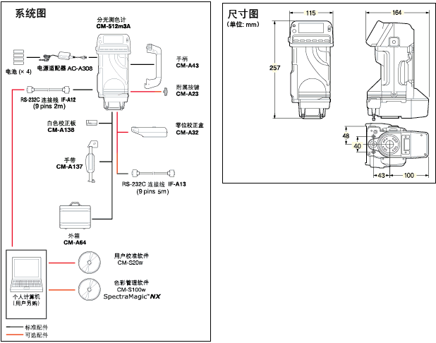 | 可選配件 | 零位校正盒CM-A32, 附屬按鍵CM-A23,RS-232C連接線IF-A13, 色彩管理軟件CM-S100w |