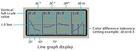 | 顯示內容 | 色度值:L*a*b*、L*C*h 色差值:Δ(L*a*b*)、Δ(L*C*h*)、ΔE*ab CMC (l:c)、ΔE00 (CIE 2000) 其他:FF值、折線圖 |
